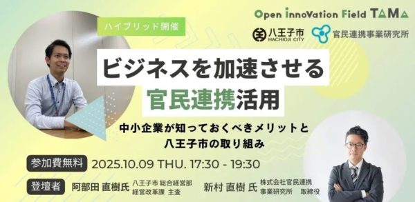 企業の社会的責任(CSR)の一環としても注目される官民連携。企業価値の向上や持続可能な社会の実現に向けて、今後ますます重要性が高まっている中、10月9日にオープンイノベーションフィールド多摩 八王子館 主催のセミナーが開催されます。